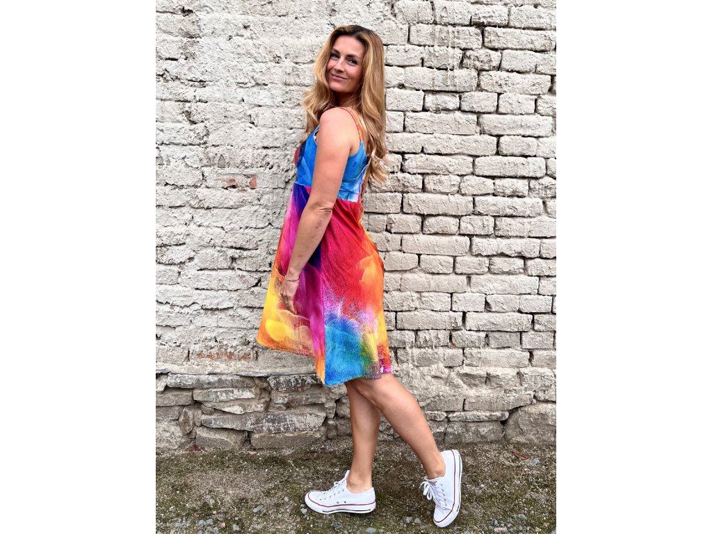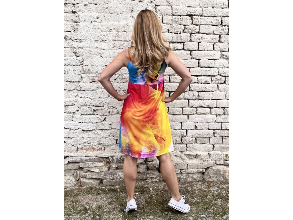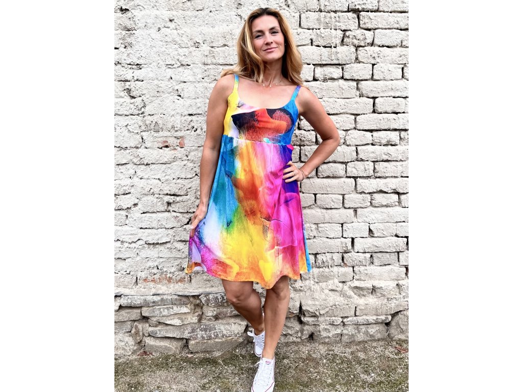 Šaty na ramínka z lehounkého, splývavého materiálu. Vzdušný, chladivý. Šaty se dají nosit dvěma způsoby. Neuvažujete, kde je předek a kde zadek. Zepředu je výstřih menší, zezadu větší. Jednoduše je otočíte jakkoliv budete chtít. Oblečete a jdete.